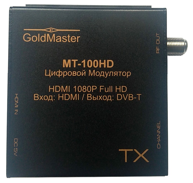 HDMI-модулятор GoldMaster MT-100HD Single DVB-T позволяет промодулировать несущую частоту одного из каналов в метровом (МВ-3) или дециметровом (ДМВ) диапазоне цифровыми сигналами через HDMI интерфейс с максимальным разрешением Full HD 1080p от источника (спутникового ресивера, камеры, DVD плеера, компьютера или другого устройства), для последующего их приема на антенный вход телевизора, оснащенного DVB-T/T2 тюнером, посредством коаксиального кабеля. При этом для приема сигнала с модулятора можно использовать одновременно несколько телевизоров. Максимальная дальность передачи сигнала составляет до 500 метров при использовании коаксиального кабеля стандарта SYV-75-5.